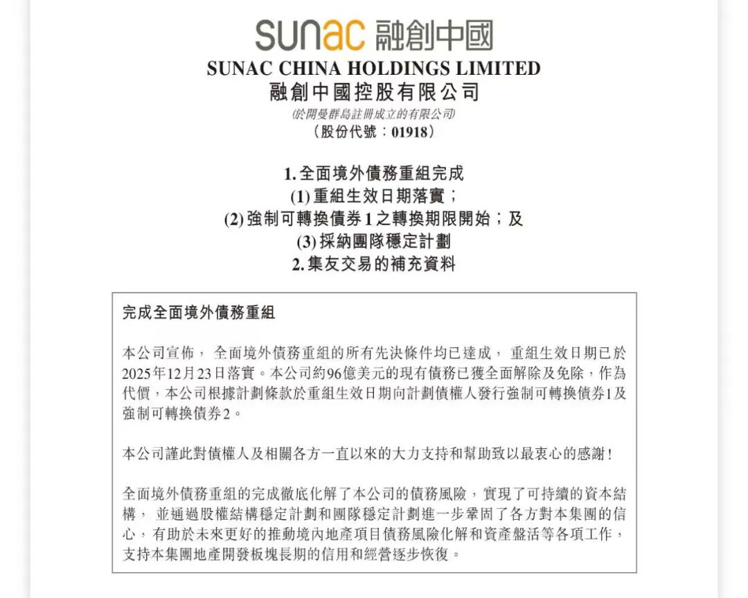 公司债务重组完成 - 融创中国境外债务重组已于2025年12月23日全面完成并生效 [1] - 公司约96亿美元的现有债务已获全面解除及免除 [1] - 作为重组代价 公司向计划债权人发行了强制可转换债券1及强制可转换债券2 [1] 公司财务压力缓解 - 通过境内外债务重组 公司整体偿债压力预计下降近600亿元 [1]