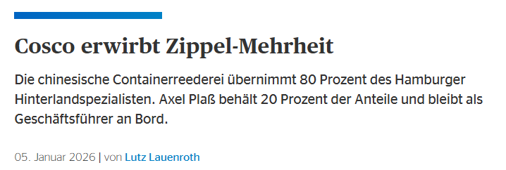 交易核心信息 - 中远海运计划通过其新成立的荷兰全资子公司Goldlead Supply Chain Development (Europe) B.V.,收购位于汉堡的物流公司Konrad Zippel 80%的股权 [1][11] - 交易已向德国联邦卡特尔局提交申报 [2][12] - 出售方Zippel集团的总经理Axel Plaß将保留剩余20%股权并继续担任运营总经理,出售起因是联合总经理Axel Kröger希望退出公司 [3][13] - 除中远海运外,另有两家私募股权公司及多式联运市场的同业竞争者曾表达收购意向 [5][15] 收购标的公司概况 - Konrad Zippel是Zippel集团的核心运营企业,该集团成立于1876年,年营业收入约7500万欧元(约合人民币6亿元) [5][15] - 该公司专门从事通过公路、铁路和内河水路往返汉堡港的集装箱运输业务,运营着200辆卡车的车队 [5][15] - 2024年,Zippel在汉堡港与不来梅哈芬港的腹地运输业务中,共处理了20.5万标准箱的货量,其中约80%通过铁路运输完成 [5][15] - 集团自主运营着汉堡、不来梅哈芬至柏林、施科保及里萨的整列班列,并拥有500节自备货车车厢和3台自有机车 [5][15] 中远海运的战略意图 - 此次收购是中远海运向欧洲多式联运业务拓展战略迈出的第一步,旨在通过铁路网络开拓中欧与西欧的腹地市场 [6][16] - 公司对多式联运业务布局关注已久,有清晰的规划以超越纯海运业务在欧洲实现进一步发展 [6][16] - 选择收购Konrad Zippel的一个重要考量在于,中远海运已制定海铁联运业务拓展规划,而Zippel将在该战略中扮演关键角色 [5][15] - 若收购完成,中远海运将进一步增强对集装箱腹地物流业务的掌控 [8][18] 中远海运在欧洲的差异化布局策略 - 公司在欧洲大陆主要采用三种合作方式:对选定枢纽港实施全面控股;在存在政治或商业限制的港口采取战略性少数股权参与;以及建立纯商业合作关系 [8][18] - 在希腊比雷埃夫斯港,中远海运持有比雷埃夫斯港务局(PPA)67%的控股权,将其打造为地中海第一、欧洲第四大集装箱港口 [10][20] - 在安特卫普和鹿特丹等北欧主要港口,公司通过中远海运港口有限公司与多方合作伙伴共同参股码头,旨在优化网络布局并保持联盟灵活性,而非谋求主导地位 [10][20] - 汉堡港属于第二类,德国政府将中远海运在汉堡港托勒罗特集装箱码头(CTT)的持股比例上限定为24.99%,确保其无法参与码头治理或影响港口运营方的整体战略 [10][20] 交易背景与公司现有基础 - 中远海运已参与运营汉堡港托勒罗特集装箱码头(CTT)多年,并持有该码头24.99%的股权,其在亚欧航线上的货物集中通过CTT进行流转处理 [2][12] - Goldlead是中远海运为推进在欧洲的码头及腹地业务拓展而新设立的全资控股平台公司 [2][12] - 出售方总经理Plaß解释,鉴于Zippel良好的经营状况,收购成本将相对高昂,且在经济动荡背景下风险大,因此集团在2024年底将公司推向市场试探买家意向 [3][13] - 出售方选择中远海运的原因包括认为私募股权和同业竞争者并非对员工的最佳选择,且中远海运是能善用公司专业知识和员工并推动企业持续发展的投资者 [5][15]