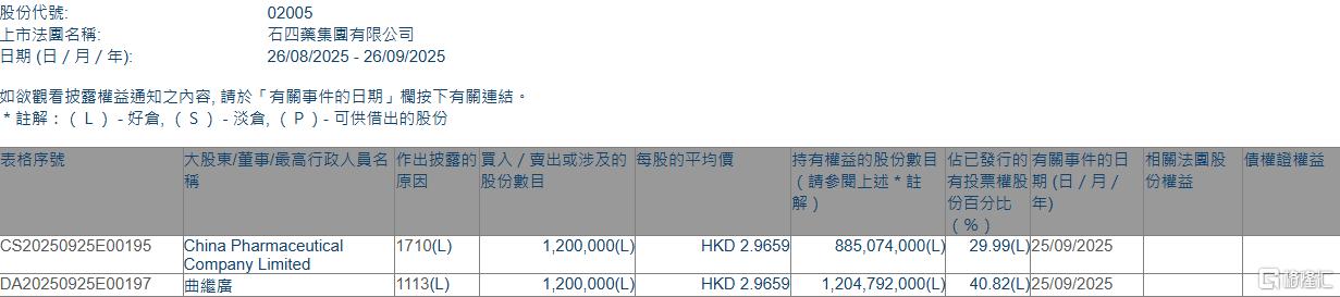 公司股权变动 - 执行董事兼主席兼行政总裁曲继广于2025年9月25日以每股均价2.9659港元增持公司120万股股份[1] - 本次增持涉及资金约355.91万港元[1] - 增持后曲继广持股数量增至1,204,792,000股[1] 持股比例变化 - 曲继广持股比例由40.78%上升至40.82%[1] - 中国医药集团有限公司同期持有885,074,000股[2] - 中国医药集团有限公司持股比例为29.99%[2] 交易详细信息 - 交易日期为2025年9月25日[1] - 交易通过场内交易方式进行[1] - 股份代码为02005[2]