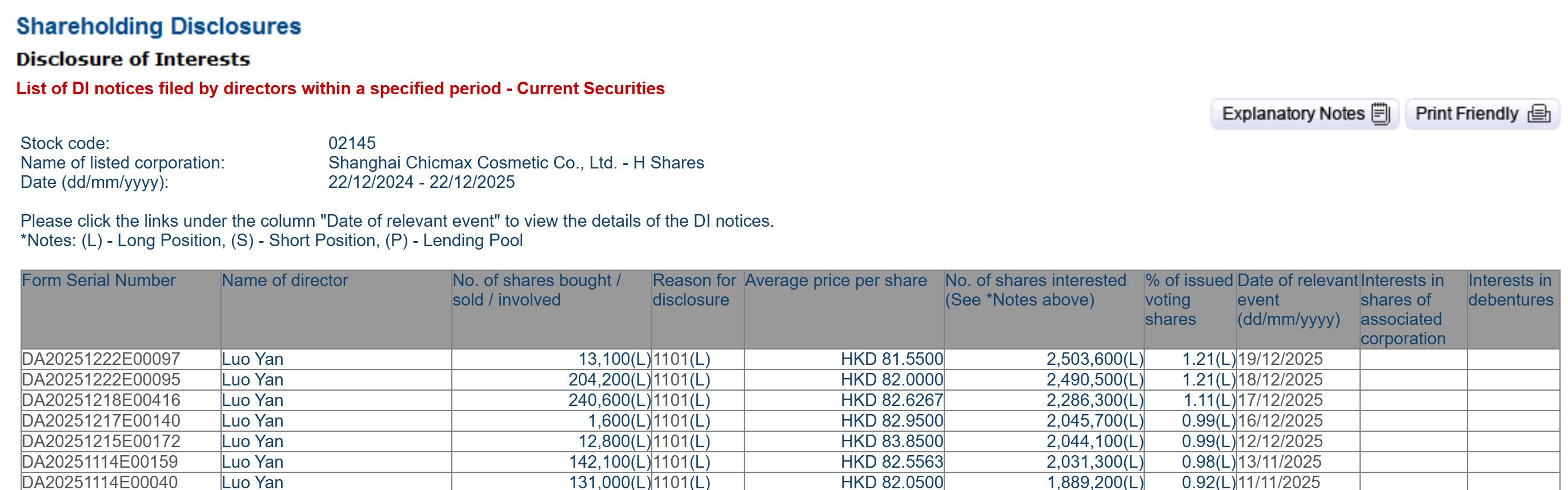 | 表格序號 | 大股東/董事/最高行政人員名稱 作出披露的 買入 / 費出或涉及的股 每股的平均價 | | | | | 持有權益的股份數目 佔已發行的 有關事件的日 | | | --- | --- | --- | --- | --- | --- | --- | --- | | | | 原因 | 份數目 | | | (請參閱上述*註解)有投票權股 (日 / 月 / 年 | | | | | | | | | 份自分比 | | | | | | | | | (%) | | | DA20251218E00416 | 罗菲 | 1101(L) | | 240.600(L | HKD 82.6267 | 2,286,300(L) | 1.11(L)17/12/2025 | | 股份代號: | 02145 | | --- | --- | | 上市法國名稱: | 上海上美化妝品股份有限公司 - H股 | | 日期 (日 / 月 / 年): | 22/11/2025 - 22/12/2025 | 格隆汇12月22日丨根据联交所最新权益披露资料显示,2025年12月17日,上美股份(02145.HK)获执行董事罗燕在场内以每股均价 ...