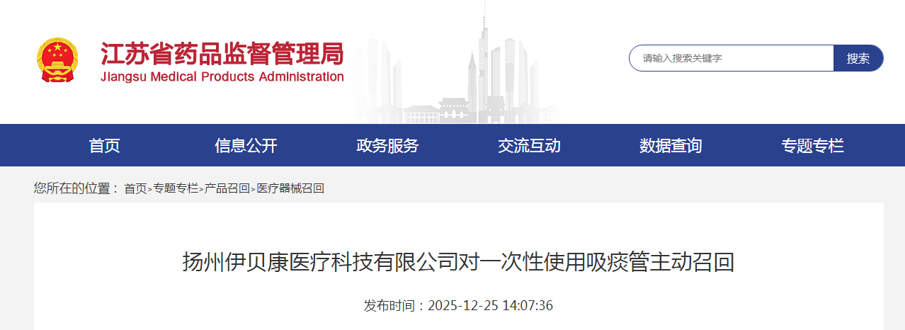 扬州伊贝康医疗科技有限公司对一次性使用吸痰管主动召回