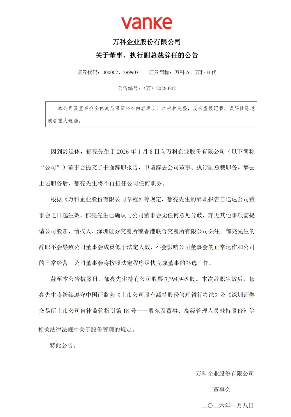 公告明确,郁亮的辞职报告自送达董事会之日起生效,辞职后其将不再担任万科任何职务。作为公司核 心管理层成员,郁亮在任期间深度参与企业战略规划与经营管理,此次变动不会导致公司董事会成员低 于法定人数,亦不会对日常经营及董事会正常运作产生影响。万科方面表示,将按法定程序尽快完成董 事补选,保障公司治理连续性。 截至公告披露日,郁亮持有万科739.49万股股份,辞职后仍需严格遵守中国证监会及深圳证券交易所关 于上市公司股东股份管理的相关规定。据公开履历,郁亮深耕万科多年,任职期间见证并推动企业多项 重大战略落地,其退休辞任属于正常人事更替。 编辑:张蓓 文/黄指南 1月8日,万科企业股份有限公司发布人事公告,万科董事、执行副总裁郁亮因到龄退休,正式提交书面 辞职报告,申请辞去相关职务。 ...