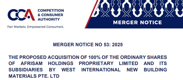 并购交易核心信息 - West International New Building Materials公司拟收购南非水泥集团AfriSam及其子公司100%普通股 [1] - 博茨瓦纳竞争与消费者管理局已收到相关合并申报 [1] - 公告未披露此次收购的财务细节 [1] 交易相关方背景 - 收购方West International New Building Materials由尧柏国际控股有限公司全资拥有并完全控制 [1] - 尧柏国际控股有限公司隶属于西部水泥有限公司 [1] - 被收购方AfriSam为南非主要水泥企业 [1] - AfriSam业务覆盖南非、莱索托和斯威士兰等多国 [1]