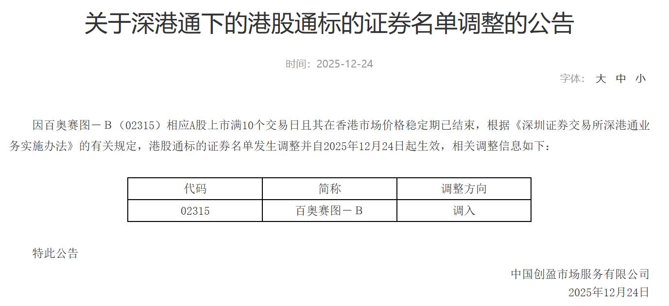12月24日,深交所发布《关于深港通下的港股通标的证券名单调整的公告》,因百奥赛图-B(02315)相应A股上市满10个交易日且其在香港市场价格稳定期已 结束,根据《深圳证券交易所深港通业务实施办法》的有关规定,将百奥赛图调入港股通,相关调整自2025年12月24日起生效。 | 代码 | 简称 | | 调整方向 | | --- | --- | --- | --- | | 02315 | 百奥赛图- | - B | 调 | ...
