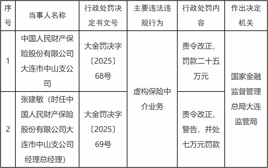 公司违规处罚事件 - 中国人民财产保险股份有限公司大连市中山支公司因虚构保险中介业务被国家金融监督管理总局大连监管局处罚 [1][2] - 公司被责令改正并处人民币二十五万元罚款 [1][2] - 时任公司经理总经理张建敏对违规行为负有责任 [1] - 张建敏被责令改正、警告并处人民币七万元罚款 [1][2] - 行政处罚决定书文号分别为大金罚决字〔2025〕68号和69号 [1][2]