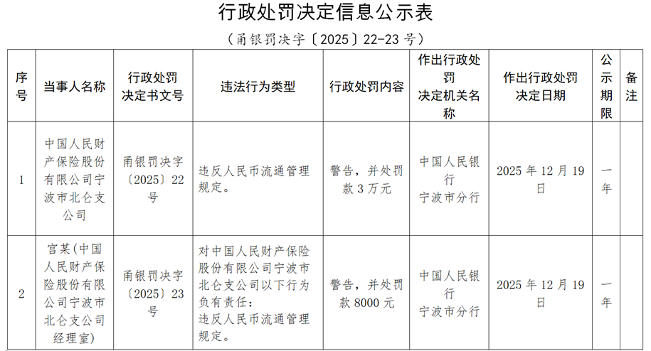 中国经济网北京12月27日讯 中国人民银行网站昨日披露中国人民银行宁波市分行行政处罚决定信息公示表(甬银罚决字 〔2025〕22-23号)。 公告显示,中国人民财产保险股份有限公司宁波市北仑支公司违反人民币流通管理规定,中国人民银行宁波市分行对其处以 警告,并处罚款3万元。宫某(中国人民财产保险股份有限公司宁波市北仑支公司经理室)对上述行为负有责任,被处警告,并处罚 款8000元。 以下为原文: | | | | | | 作出行政处 | | 公 | | | --- | --- | --- | --- | --- | --- | --- | --- | --- | | । दि | 当事人名称 | 行政处罚 | 违法行为类型 | 行政处罚内容 | 同 | 作出行政处罚 | 示 | 备 | | 름 | | 决定书文号 | | | 决定机关名 | 决定日期 | 期 | 注 | | | | | | | 称 | | 限 | | | | 中国人民财 产保险股份 | 雨银罚决字 | | | 中国人民银 | | | | | 1 | 有限公司宁 | (2025) 22 | 违反人民币流通管理 | 警告,并处罚 | 行 | 202 ...