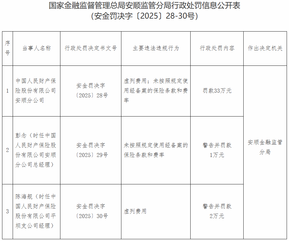 陈海舰(时任中国人民财产保险股份有限公司平坝支公司经理)对虚列费用的违法违规行为负有责任。安顺金融监管分局对其警告并 罚款2万元。 中国经济网北京12月25日讯 国家金融监督管理总局网站昨日公布的安顺监管分局行政处罚信息公开表(安金罚决字〔2025〕28-30号) 显示,中国人民财产保险股份有限公司安顺分公司虚列费用;未按照规定使用经备案的保险条款和费率。安顺金融监管分局对其罚款33万 元。 彭念(时任中国人民财产保险股份有限公司安顺分公司总经理)对未按照规定使用经备案的保险条款和费率的违法违规行为负有责 任。安顺金融监管分局对其警告并罚款1万元。 (责任编辑:田云绯) 以下为原文: | 序 특 | 当事人名称 | 行政处罚决定书文号 | 主要违法违规行为 | 行政处罚内容 | 作出决定机关 | | --- | --- | --- | --- | --- | --- | | 1 | 中国人民财产保 险股份有限公司 安顺分公司 | 安金罚决字 (2025) 28号 | 虚列费用;未按照规定使 用经备案的保险条款和费 खुर | 罚款33万元 | | | 2 | 彭念(时任中国 人民财产保险股 | 安金罚决字 | ...