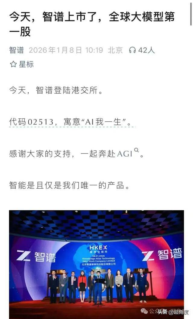恭喜智谱上市,成为全球大模型第一股。 朋友圈、群里要么是恭喜它成为第一股,要么是讨论打新、暗盘、股价涨了跌了。 行业讨论的是市值、营收亏损、市盈率、投资人赚了多少。笔记本的屏幕闪烁着智谱的股价走势图。 此刻,一个身披前沿AI技术、胸怀光明远大AGI理想的公司,又不可避免的落入了资本叙事的俗套里。 今天,智谱上市了,全球大模型第 - 服 智谱 2026年1月8日 10:19 北京 ✪ 42人 ☆ 星标 今天,智谱登陆港交所。 代码02513, 寓意"Al 我一生"。 感谢大家的支持,一起奔赴AGI 。 智能是且仅是我们唯一的产品。 公 分条 @超角度 智谱官方文章也特意注明自己是大模型第一股,还用02513"AI我一生"这样的谐音梗玄学来寓意。 从标题来看,"今天,上市了,第一股",仿佛达成了一个大的目标,长舒一口气。 接着就互相问"你买了多少B?"。。。接着一起参加各种酒会,咖啡厅里讨论B。 后来,区块链凉了,元宇宙又火了,好像信仰也是去中心化。小扎就信仰这个,让Facebook改名Meta, 然后就被带沟里去了,亏的一塌糊涂,也没搞出个啥。 后来又冒出来web3概念,圈里的人变成了数字游民,他们住到了大理, ...