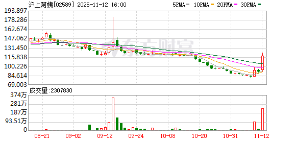 港股新消费概念沪上阿姨尾盘进一步拉升,最高涨超35%,报123港元!成交额放大至超2亿港元