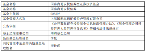 国泰海通安悦债券国泰海通安裕中短债债券增聘李夏