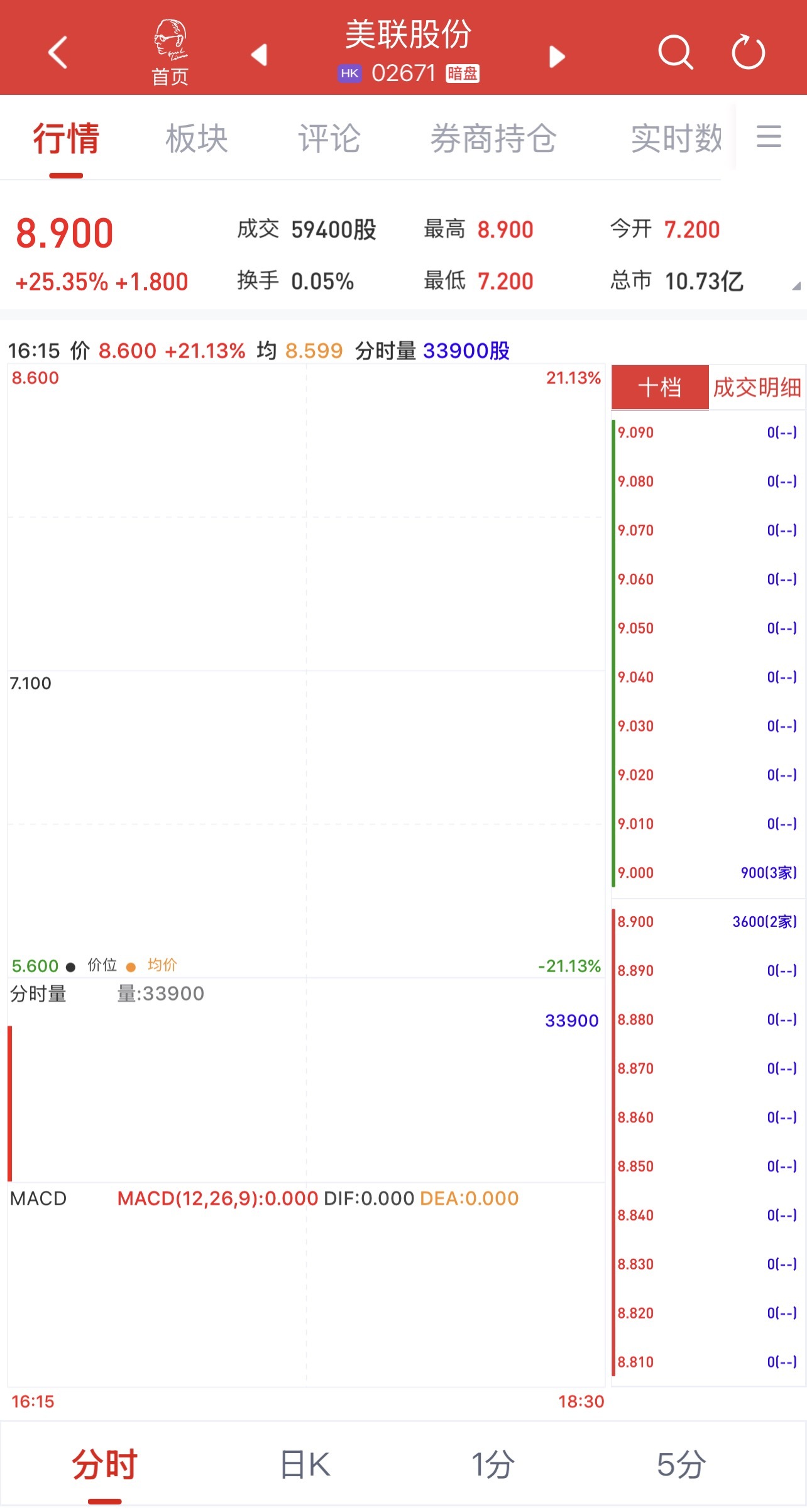 | 8.600 | | | 21.13% | 十档 | | --- | --- | --- | --- | --- | | | | | | 9.090 | | | | | | 9.080 | | | | | | 9.070 | | | | | | 9.060 | | | | | | 9.050 | | 7.100 | | | | 9.040 | | | | のコミニコニコ | | 9.030 | | | | | | 9.020 | | | | | | 9.010 | | | | | | 9.000 | | | | | | 8.900 | | | 11/1 - | VIFT | 04 4001 | | -21.13% |8.890 1112 . 1112 . 2111 分时量 量:33900 33900 8.880 8.870 8.860 8.850 MACD(12,26,9):0.000 DIF:0.000 DEA:0.000 MACD 8.840 8.830 8.820 8.810 16:15 18:30 分时 1分 5分 日K • 行情来源: 利弗莫尔证券 • 美联股份(02671)将于12月30日(周二 ...