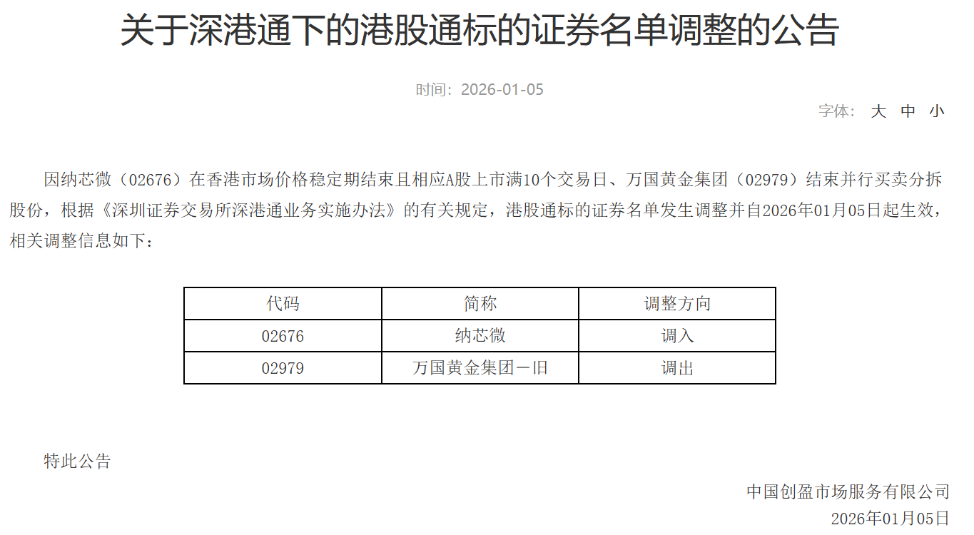 | 代码 | 简称 | 调整方向 | | --- | --- | --- | | 02676 | 纳芯微 | 调入 | | 02979 | 万国黄金集团一旧 | 调出 | 1月5日,深交所发布《关于深港通下的港股通标的证券名单调整的公告》指出,因纳芯微(02676)在香港市场价格稳定期结束且相应A股上市满10个交易日、 万国黄金集团(02979)结束并行买卖分拆股份,根据《深圳证券交易所深港通业务实施办法》的有关规定,港股通标的证券名单发生调整:调入纳芯微 (02676)、调出万国黄金集团-旧(02979),相关调整自2026年01月05日起生效。 ...