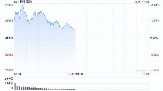 12月29日消息,港股三大指数集体上涨。截至午间收盘,恒生指数涨0.26%,报25886.75点,恒生科技 指数涨1.60%,国企指数涨0.77%。盘面上,科网股普涨,网易、美团涨超2%,百度、联想、快手、哔 哩哔哩涨超1%;汽车股走强,蔚来涨超6%;脑机接口概念普涨,心玮医疗涨超10%;纸业股涨幅居 前,玖龙纸业涨超4%。 | 名称 | | 最新价 | 涨跌幅 √ | | --- | --- | --- | --- | | 但生科技指数 | NY | 5587.24 | +1.60% | | 800700 | | | | | 国企指数 | ี | 8983.59 | +0.77% | | 800100 | | | | | 恒生指数 | 200 | 25886.75 | +0.26% | | 800000 | | | | 汽车股走强,蔚来涨超6%。方正证券发布研报称,中央经济工作会议及财政部明确优化"两新"政策, 多地遴选以旧换新平台企业。据媒体披露,2026年国补将延续,单车最高补3万元,聚焦淘汰老旧高排 放车辆,同时提升新能源补贴与混动车型纯电续航门槛。 脑机接口概念普涨,心玮医疗涨超10%。光大证券发布 ...