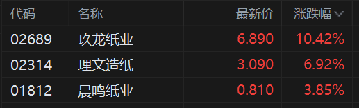纸业股涨幅扩大 玖龙纸业大涨超10%刷新阶段新高