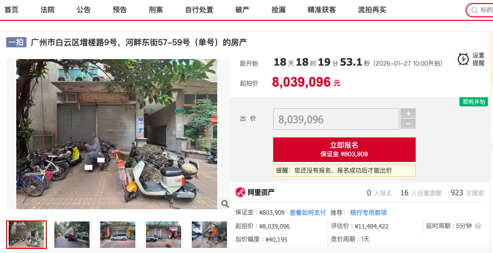 业绩方面,2025年上半年,富力地产营业收入同比下降近六成至57.65亿元,股东应占溢利亏损40.46亿元;账上现金及现金等价物(含受 限资金)仅35.08亿元,而同期流动负债高达2481亿元,其中一年内到期的短期债务就有975.9亿元。 富力地产表示,就上述相关案件,公司及相关子公司仍在与相关机构积极沟通,争取达成妥善的解决方案。 1月7日晚间,富力地产发布关于被执行事项相关进展的公告。近日,根据淘宝网司法拍卖网络平台显示的信息,广州市中级人民法院将于 2026年1月27日10时起,至2026年1月28日10时,就公司名下位于广州市白云区增槎路9号河畔东街57-59号(单号)房产(富力半岛花园)进 行拍卖活动,起拍价为803.91万元。 读创财经梳理富力地产2025年以来司法拍卖信息发现,其资产处置已从主动出售转向被动拍卖,且覆盖范围不断扩大,包括酒店、商业综 合体、住宅底商等核心资产接连登上司法拍卖平台。 | 自行处置 | 首页 | 法院 | 公告 | 预告 | 刑案 | 破产 | 流拍再买 | 拉漏 | 精准获客 | | --- | --- | --- | --- | --- | --- | --- | ...