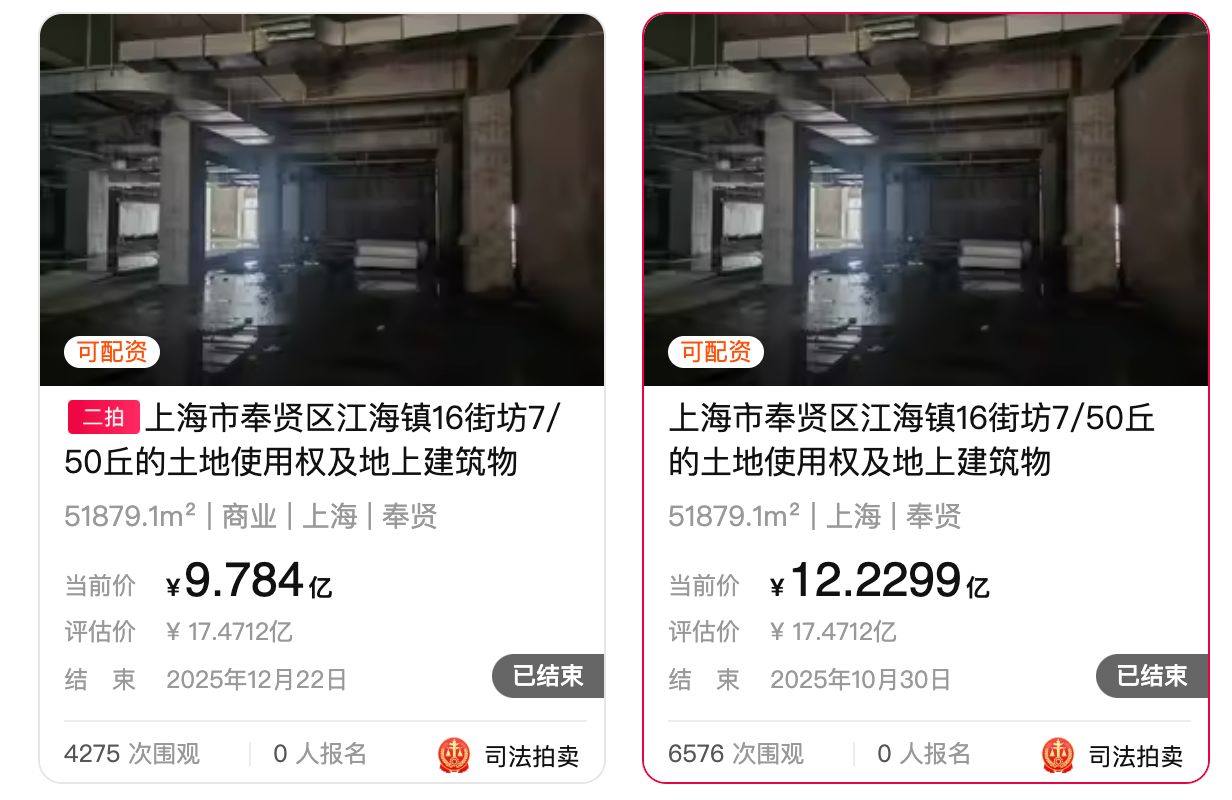 12月19日,奉贤富力万达广场第二次挂牌拍卖,起拍价9.784亿元,标的物评估价约17.47亿元,相当于打了五六折。 该项目10月30日首次挂牌时起拍总价约12.23亿元,已经是七折甩卖。 据阿里资产平台显示,该两次拍卖共吸引超万次围观,249人设置了拍卖提醒,不过报名人数为零。 12月22日,位于上海市奉贤新城的奉贤富力万达广场二次流拍。 据拍卖介绍信息,被拍标的物富力万达广场,规划总建筑面积约26.13万平米,共有14幢楼,土地用途为铁路用地、商业、办公。 据拍卖条款,目前该项目处于查封状态,买受人全额支付拍卖成交款后,法院一并办理解除抵押、解除查封手续。 此前,拍卖标的被上海市第一中级人民法院正式查封;该项目抵押权人为中国建设银行上海奉贤支行,债权数额为7.31亿元,债务履行期限从2019年7月4日 至2028年12月20日。 奉贤富力万达广场是富力地产与万达集团共同打造的城市综合体项目,包括7万平米的万达广场、近5万平米的商业街和约4万平米的高端商务写字楼。但由 于富力地产资金链断裂,该项目在2021年底停工。 目前该项目为空置状态,证照齐全,主体结构已验收,并取得部分建筑的预售许可。大部分楼的外立面 ...