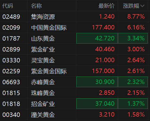 鉴于地缘政治风险加剧、实物短缺以及美联储独立性再次出现不确定性,花旗集团上调了其对贵金属的 短期展望。包括Max Layton在内的分析师在电邮中写道,未来0-3个月的黄金目标价从每盎司4200美元 上调至每盎司5000美元,白银目标价从每盎司62美元上调至每盎司100美元。 | 代码 | 名称 | 最新价 | 涨跌幅 √ | | --- | --- | --- | --- | | 02489 | 集海资源 | 1.240 | 8.77% | | 02099 | 中国黄金国际 | 177.400 | 6.16% | | 01787 | 山东黄金 | 42.720 | 3.34% | | 02899 | 三十四年薪 | 40.460 | 3.00% | | 03330 | 灵宝黄金 | 21.000 | 2.64% | | 02259 | 紫金黄金国际 | 157.000 | 2.61% | | 06693 | 赤峰黄金 | 30.900 | 2.32% | | 01815 | 珠峰黄金 | 2.850 | 2.15% | | 01818 | 招等矿业 | 37.040 | 1.37% | | 00340 | ...