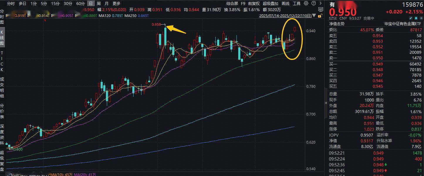 有色“夺冠在望”!紫金矿业拉升4%,有色ETF华宝(159876)跳空大涨2%,距上市高点仅一步之遥!
