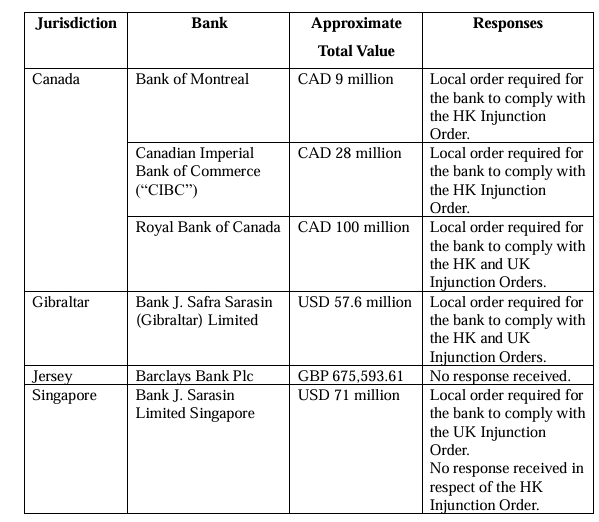 法院裁决与资产冻结范围 - 香港高等法院采纳恒大清盘人主张,扩大对许家印前妻丁玉梅的禁制令范围,将其在加拿大、直布罗陀、泽西岛和新加坡约2.2亿美元(约合人民币15.58亿元)的资产纳入冻结[1] - 被冻结的资产具体包括:加拿大皇家银行账户1亿加元(约5.03亿人民币)、嘉盛莱宝银行新加坡账户7100万美元(约5.03亿人民币)、瑞士银行(直布罗陀)账户5760万美元(约4.08亿人民币)、泽西岛巴克莱银行账户67.5万英镑(约629.8万人民币)[1] - 香港高等法院允许恒大清盘人在加拿大、直布罗陀、泽西岛和新加坡四个特定司法管辖区采取有限度的境外行动,以申请配套命令使冻结令有效[5] 资产冻结的执行挑战 - 多家银行表示仅凭香港或英国法院命令不足以冻结资产,需要取得当地法院签发的正式命令方可执行[4] - 部分银行对相关禁令未作出实质回应,例如泽西岛巴克莱银行未回复,新加坡银行未就香港禁令作出回应[4] - 恒大律师已向资产披露中列明的银行发函,通知其香港和英国法院的禁令,目的是冻结丁玉梅的相关账户[3] 法律程序中的争议 - 恒大的律师指丁玉梅对香港及英国的法律程序采取"总体不合作态度",具体表现为突然变更物业处置立场、拒绝提供账户赎回资金详情、阻碍账户合规核实等[3] - 丁玉梅一方律师抗辩称其无资产耗散意图,恒大的申请将导致其承担巨额跨国律师费,构成不当压迫,并认为应等待其"解除禁制令申请"的判决结果[3] - 香港高院对清盘人的境外行动权限作出严格限定,仅限于配套保全程序,不得提起新的实体索赔或寻求明显不同的救济[5]