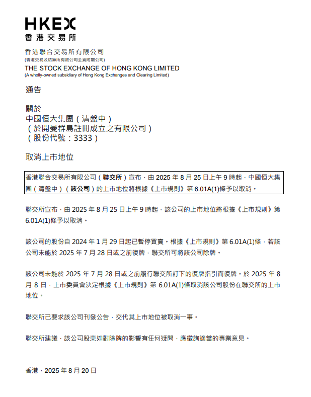 港交所宣布2025年8月25日取消中国恒大上市地位