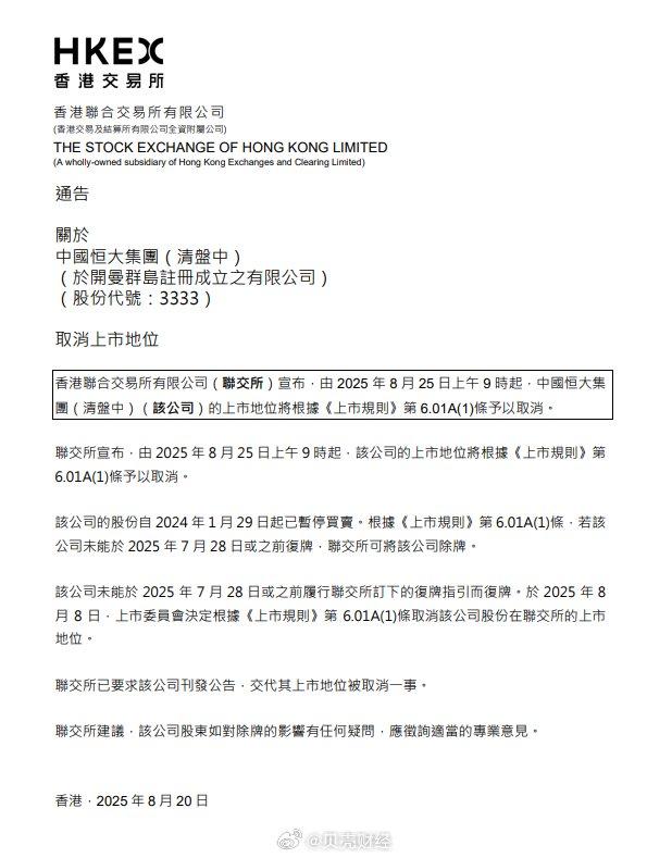 公司上市地位变动 - 港交所宣布自2025年8月25日上午9时起取消中国恒大上市地位 [1] - 上市地位取消依据为《上市规则》第6.01A(1)条 [1] 监管合规行动 - 港交所根据规则条款执行上市地位取消程序 [1]