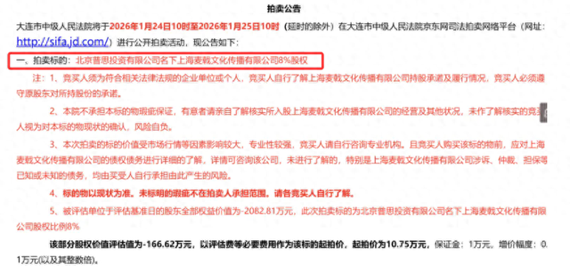 转自:财话连篇 又遭一击!王思聪名下资产被法拍,"靠山"万达也陷入债务困境。 根据法院的拍卖公告,北京普思投资有限公司名下麦戟文化传播有限公司8%股权正式拍卖,评估值 为-166.62万元,起拍价10.75万元。 公开资料显示,北京普思投资正在王思聪100%持股的公司。麦戟文化是一家沉浸式真人互动游戏剧公 司,北京普思在2019年投资了这家公司,目前持股10%。但这家公司在2024年就已经大规模裁员、关 店,陷入了困境。 作为王健林的独子,王思聪5岁就出国留学,一直到大学毕业才回国。回国后,王思聪凭借着首富儿子 的身份,以及在社交媒体的言论,迅速积累了人气,成为了最知名的富二代。 那几年,王思聪一边在事业上大展身手,一边风流无边,频繁换女朋友。王健林大手一挥,就给了王思 聪5个亿,让他练练手。 于是,王思聪就成立北京普思投资,做起了投资生意,先后投资了几十个项目,包括英雄互娱、熊猫互 娱、乐视体育、笑果文化等知名公司。 熊猫互娱应该是王思聪最成功的项目,旗下的熊猫直播曾经获得多轮投资,估值50亿元。而王思聪在电 竞圈更是打出了名气,带领团队取得国际赛事冠军。 王思聪业务遍地开花,并且还发展的很不错,连王健林都 ...