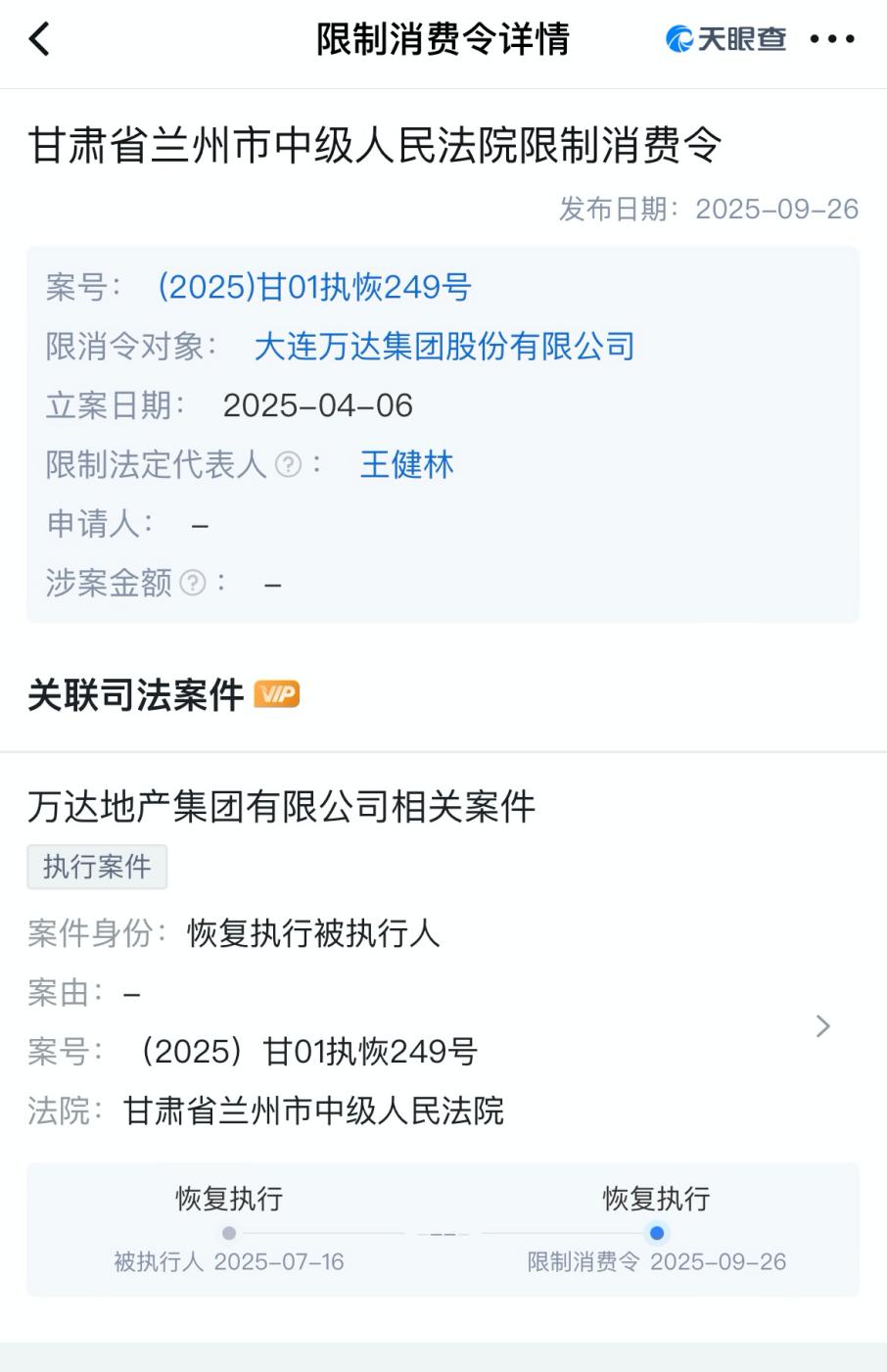 限制消费令详情 - 大连万达集团股份有限公司被甘肃省兰州市中级人民法院发布限制消费令 限制法定代表人王健林[2] - 限制消费令案号为(2025)甘01执恢249号 立案日期为2025年4月6日[2] - 案件身份为恢复执行被执行人 执行法院为甘肃省兰州市中级人民法院[2] 公司被执行情况 - 大连万达集团股份有限公司共有10条被执行人信息 合计被执行金额达52.63亿元[4] - 公司涉及38条股权冻结信息[4] - 此次限制消费令因下属项目公司经济纠纷导致 公司表示之前一直在通过多种方式协商解决[4] 案件关联信息 - 关联司法案件涉及万达地产集团有限公司相关案件[2] - 案件案由未明确披露 申请人信息未公开[2] - 公司内部人士表示本次限制消费令或因在执行层面信息不对称导致[4]