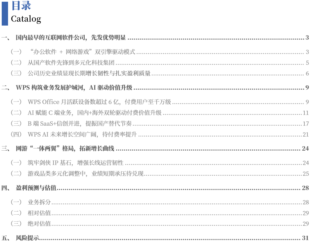 文章核心观点 - 金山软件作为国内最早的互联网软件公司之一,凭借先发优势形成了“办公软件及服务+网络游戏及其他”双轮驱动的稳健商业模式 [2][16] - 公司的核心护城河WPS Office正通过AI赋能实现价值升级,用户活跃度与付费转化率显著提升,B端业务增长迅猛 [2][16] - 网络游戏业务短期因新游表现分化及老游戏收益回落而承压,但公司正通过巩固核心IP、拓展新品类及推动出海来开拓新的增长曲线 [3][17] 一、国内最早的互联网软件公司,先发优势明显 - 公司始创于1988年,是国内最早的互联网软件企业之一,业务涉及金山办公、西山居、金山世游等,并拥有金山云、猎豹移动等联营公司 [2][16] - 商业模式已形成“办公软件及服务+网络游戏及其他”双轮驱动格局,2024年办公软件业务收入51.21亿元,游戏业务收入51.97亿元 [2][16] - 公司毛利率长期维持在80%以上高位,财务结构稳健,现金流充沛 [2][16] 二、WPS构筑业务发展护城河,AI驱动价值升级 - WPS Office全球月活跃设备数(MAU)在2025年9月已达6.69亿,同比增长9%,累计付费用户数达4179万,同比增长10% [2][16] - 公司以“AI、协作、国际化”为核心,推出WPS AI 3.0(WPS灵犀),构建了AI语音助手、AIPPT、AI知识库、AI改文档、AI数据助手五大应用矩阵 [2][16] - AI赋能显著提升了用户活跃度与付费转化,B端产品WPS 365在2025年第三季度收入同比增长71.61% [2][16] - 随着信创招标加速,公司的政务AI产品已在中央及地方党政机关落地 [2][16] 三、网游“一体两翼”格局,拓新增长曲线 - 公司以《剑侠情缘》IP为核心,端游《剑网3》通过长线运营保持活力,其全平台互通版本《剑网3无界》上线后用户回流显著 [3][17] - 公司正积极拓展科幻(如《解限机》)、二次元等新品类,并推动游戏出海,以突破对传统武侠品类的依赖 [3][17] - 新游市场表现存在分化,导致短期业绩承压,2025年第三季度网络游戏及其他业务收益同比下降47%,主要由于《解限机》等现有游戏收益回落,新上线游戏仍处于市场影响力建设初期 [3][17]