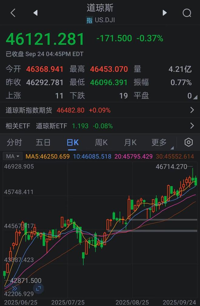 美股三大股指普跌,道指跌0.37%,纳指跌0.33%,标普跌0.28%。英特尔收涨超6%,正寻求苹果对其 进行投资。苹果、英伟达跌近1%,谷歌跌超1%,特斯拉涨超3%。 来源:滚动播报 道琼斯 < ◀ ﻤ 指 US.DJJ 46121.281 -171.500 -0.37% 已收盘 Sep 24 04:45PM EDT 今开 46368.941 最高 46453.070 量 4.21亿 昨收 46292.781 最低 46096.391 振幅 0.77% 上涨 0 / 道琼斯指数期货 46482.80 +0.09% 相关ETF 道琼斯ETF 1.193 -0.08% 分时 五日 日K 周K 月K 更多 MA - MA5:46250.659 10:46085.518 20:45795.429 30:45552.6 46928.905 46714.270- 45748.411 4456 42871.500 IEW 42206.929 2025/07/25 2025/06/25 2025/08/25 2025/09/24 ...