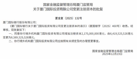 公司资本变动 - 国家金融监督管理总局厦门监管局批复同意厦门国际银行股份有限公司境外机构厦门国际投资有限公司增加注册资本 [1] - 增资额为21.7亿港元 具体由64.19525528亿港元增加至85.89525528亿港元 [1]