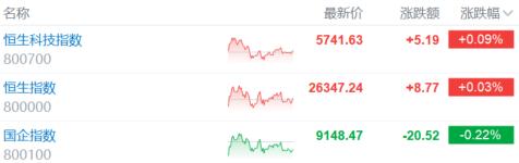1月5日,港股三大指数呈现窄幅震荡行情。 截至收盘,恒生指数微幅上涨0.03%,国企指数跌0.22%,恒生科技指数微涨0.09%。 | 名称 | | 最新价 | 涨跌额 | 涨跌幅√ | | --- | --- | --- | --- | --- | | 恒生科技指数 | | 5741.63 | +5.19 | +0.09% | | 800700 | more | | | | | 恒生指数 | May porta | 26347.24 | | +8.77 +0.03% | | 800000 | | | | | | 国企指数 | | 9148.47 | -20.52 | -0.22% | | 800100 | arring | | | | 盘面上,大型科技股走势分化,快手大涨11%表现尤其抢眼;生物医药股集体活跃,平安好医生领衔互联网医疗股上涨;内房股拉升,脑机接口概念大爆 发。汽车股全天低迷,三桶油集体下跌,内银股走低。 | 行业热力图 × | 领涨板块 | | | | | | | | | | --- | --- | --- | --- | --- | --- | --- | --- | --- | --- ...