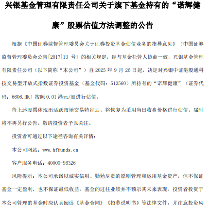 中国经济网北京9月29日讯 近日,兴银基金管理有限责任公司发布关于旗下基金持有的"诺辉健 康"股票估值方法调整的公告。 公告称,经与基金托管人协商一致,兴银基金管理有限责任公司自2025年9月26日起,决定对兴银 中证港股通科技交易型开放式指数证券投资基金(基金代码:513560)所持有的"诺辉健康"(证券代 码:6606.HK)按照0.01港元/股进行估值。 (责任编辑:康博) ...