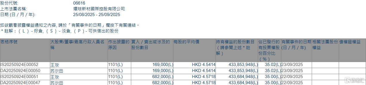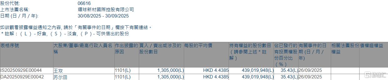 | 表格序號 | | 大股東/董事/最高行政人員名 作出披露的 買入 / 費出或涉及的 每股的平均價 | | | 持有權益的股份數目 佔已發行的有關事件的日 相關法 | | | --- | --- | --- | --- | --- | --- | --- | | | 개발 | 原因 | 股份數目 | | ( 詩参関上述 * 註 | | | | | | | | 解 份自分比 年) | | | | | | | | | 96 ) | | IS20250929E00044 | 十双 | 1101(L) | 1,305,000(L | HKD 4.4385 | 439.019.948(L) | 35.43(L)26/09/2025 | | DA20250929E00042 | 苏尔田 | 1101(L) | 1,305,000(L | HKD 4.4385 | 439,019,948(L) | 35.43(L)26/09/2025 | 格隆汇9月30日丨根据联交所最新权益披露资料显示,2025年9月26日,环球新材国际(06616.HK)获执行董事、主席兼行政总裁苏尔田在场内以每股均价 4.4385港元增持130.5 ...