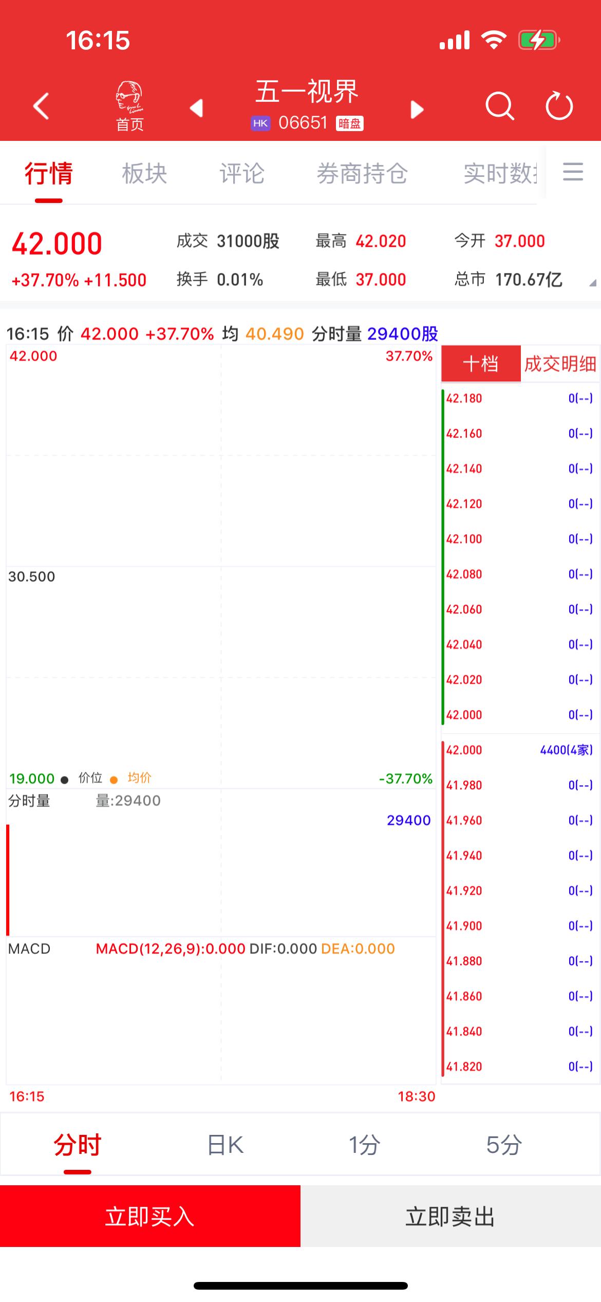 | 16:15 价 42.000 +37.70% 均 40.490 分时量 29400股 | | | | | --- | --- | --- | --- | | 42.000 | 37.70% | 十档 | 成交 | | | | 42.180 | | | | | 42.160 | | | | | 42.140 | | | | | 42.120 | | | | | 42.100 | | | 30.500 | | 42.080 | | | | | 42.060 | | | | | 42.040 | | | | | 42.020 | | | | | 42.000 | | | | | 42.000 | 4400 | | 19.000 · 价位 · 均价 | -37.70% | UDD 17 | | | 16:15 | | | | .။ 令 亞 | | --- | --- | --- | --- | --- | | V | 首页 | | 五一视界 ▲ HK 06651 暗盘 | Q C | | 行情 | 板块 | 评论 | 券商持仓 >> | 实时数: | | 42.000 | | 成交 31000股 | 最高 42. ...