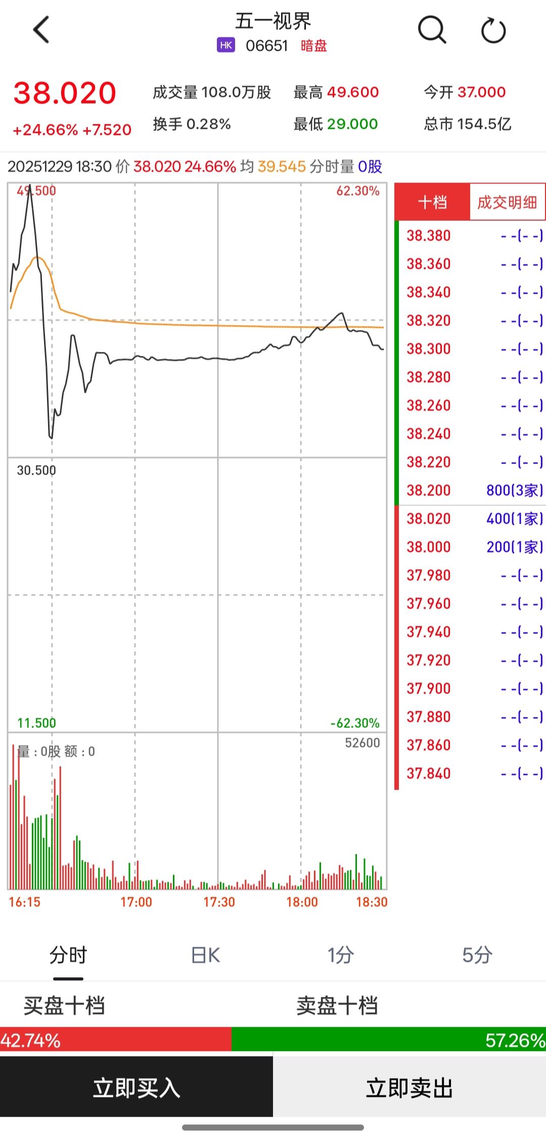 37.840 - -(- -) 16:15 17:30 18:00 5分 1分 સ્ત્ર B4 日K 卖盘十档 买盘十档 42.74% 57.26% 立即买入 立即卖出 • 行情来源: 利弗莫尔证券 • 智通财经APP获悉,五一视界(06651)将于2025年12月30日(星期二)在香港挂牌。截至收盘,利弗莫尔证券暗盘交易显示报价38.02港元,较招股价30.5港元 上涨24.66%,每手200股,不计手续费,每手赚1504港元。 ...