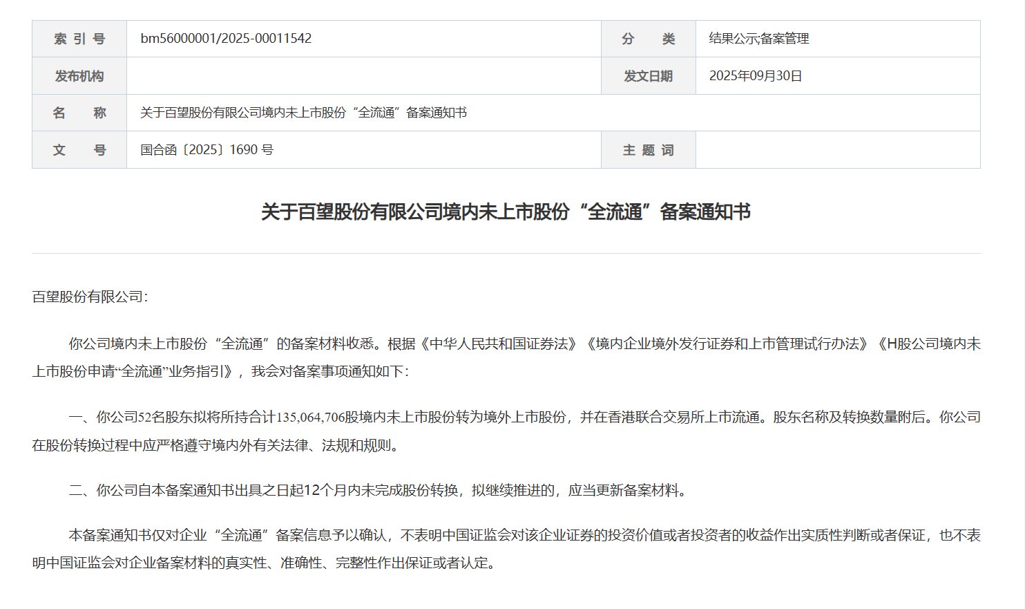 智通财经APP讯,百望股份(06657)发布公告,本公司近期已收到中国证监会就实施H股全流通而出具日 期为2025年9月29日的备案通知书(备案通知书)。根据备案通知书,本公司就合计1.35亿股境内股实施H 股全流通向中国证监会作出的备案已经完成。备案通知书自2025年9月29日起12个月内有效。本公司将 向联交所上市委员会申请批准相关H股上市及买卖。 ...