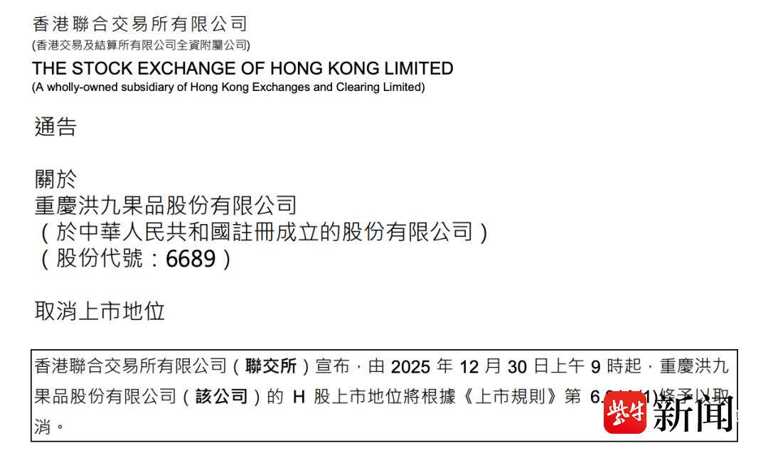 因为无法按时披露财报,停牌超过一年半,市值缩水640亿港元的"水果第一股"洪九果品(06689.HK)即 将迎来"退市时刻"。 12月24日,香港联合交易所发布取消重庆洪九果品股份有限公司上市地位的通告。通告宣布,从2025年 12月30日上午9点起,根据《上市规则》第6.01A(1)条,予以取消洪九果品的H股上市地位。 通告显示,该公司自2024年3月20日起已暂停买卖。根据上述《上市规则》,若洪九果品未能在9月19日 或之前复牌,联交所有权将该公司除牌。该公司曾于10月13日申请复核,但港交所称,上市复核委员会 维持取消公司上市地位的决定。 1987年,17岁的邓洪九只身一人来到重庆朝天门码头挑担创业卖水果。当时,他发现朝天门一带红桔的 零售价格普遍偏高,一斤要卖七八角,而自己老家长寿的价钱比这儿要便宜得多。于是,邓洪九通过在 家乡收购桔子,直接拉到重庆来卖,获得了人生的第一桶金,让他看到了"端到端"模式的巨大优势,坚 定了创业的想法。 2002年,邓洪九创办了洪九果品的前身——重庆洪九果品有限公司。2009年被获评"中国果品行业优秀 企业家",2012年获评"中国经济十大新闻人物"。 随着危机发酵,洪九 ...