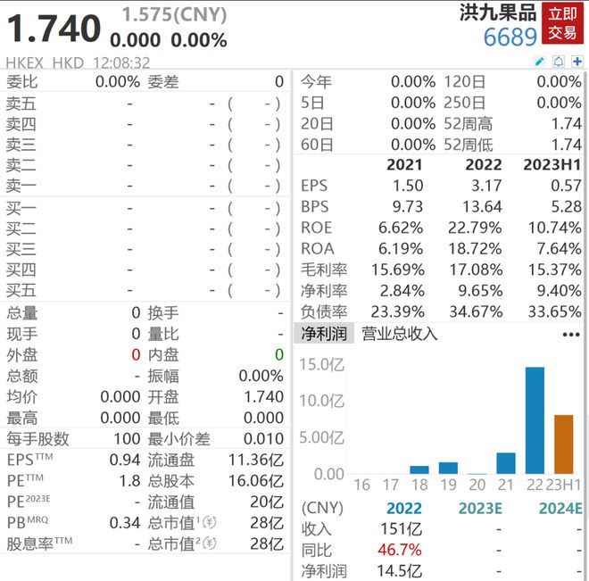 记者丨江佩佩 编辑丨张楠 停牌超过一年半的"水果第一股"洪九果品(06689.HK)迎来退市终局。 香港联交所宣布,从12月30日上午9点起,取消洪九果品的H股上市地位。 此前,因洪九果品未能在9月19日之前复牌,港交所在10月3日做出了取消公司上市地位的决定。公司曾 于10月13日申请复核,但港交所称,上市复核委员会维持取消公司上市地位的决定。 2024年4月,毕马威会计师事务所辞任公司审计。截至目前,公司仍未披露2023年年报及之后的定期报 告。 截至停牌前,洪九果品股价已跌至1.74港元,总市值仅剩27.95亿港元,较巅峰蒸发超95%。 洪九果品 立即 1.740 0.000 0.00% 6689 交易 HKEX HKD 12:08:32 0 0 + 0.00% 0.00% 120日 委比 0.00% 委差 0 交生 0.00% 250日 5日 0.00% 卖五 - ) - - 1 0.00% 52周高 卖四 20日 - ) - 0.00% 52周低 卖三 60日 - ) 卖二 2023H1 2021 2022 - - ) l 卖一 EbS 1.50 3.17 - ) - - 近一 BPS 9.73 1 ...