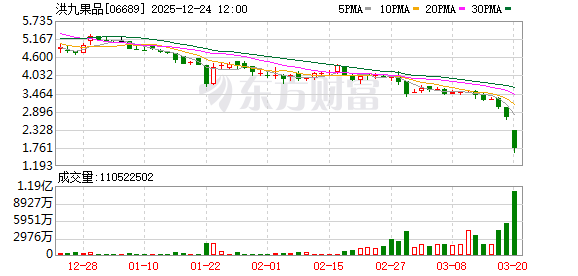 停牌超过一年半的"水果第一股"洪九果品(06689.HK)迎来退市终局。 香港联交所宣布,从12月30日上午9点起,取消洪九果品的H股上市地位。 此前,因洪九果品未能在9月19日之前复牌,港交所在10月3日做出了取消公司上市地位的决定。公司曾于10月13日申请复核,但港交所称,上市复核委员 会维持取消公司上市地位的决定。 | | 洪九果品[06689] 2025-12-24 12:00 | | | 5PMA = | 10PMA = 20PMA = 30PMA = | | --- | --- | --- | --- | --- | --- | | 5.735 | | | | | | | 5.167 | | | | | | | 4.600 | | | | | | | 4.032 | | | | | | | 3.464 | | | | | | | 2.896 | | | | | | | 2.328 | | | | | | | 1.761 | | | | | | | 1.193 | | | | | | | 1.19亿 | 成交单:110522502 | | | | | | 8927万 | | | | | | | 59 ...