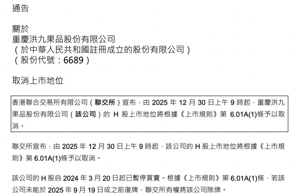 瑞财经 刘治颖 12月24日,香港联交所宣布,由2025年12月30日上午9时起,洪九果品(06689.HK)的H股上市地位将予以取消。 洪九果品的H股自2024年3月20日起已暂停买卖。因公司未能于2025年9月19日或之前复牌。港交所在10月3日做出了取消公司上市地位的决定。公司曾于10 月13日申请复核,但港交所称,上市复核委员会维持取消公司上市地位的决定。 洪九果品于2022年9月5日在港交所挂牌上市,成为"水果第一股"。当时以每股40港元的价格发行1429.49万股、募资5.72亿港元。截至停牌之日,洪九果品每 股报1.74港元,股价较IPO发行价跌95.65%,总市值为27.95亿港元。 公开资料显示,洪九果品于2002年在重庆创立,创始人为邓洪九及其妻子江宗英。 洪九果品主要从事水果批发,其在原产地采购水果后,在当地水果工厂进行加工、分级筛选,再进一步分销到中国的各个销售渠道。其主要水果采购自泰国 和越南,有榴莲、山竹、龙眼、火龙果、车厘子、葡萄。 相关公司:洪九果品 ...