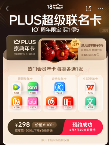 京东PLUS会员年度盛典活动详情 - 年度盛典于1月7日晚8点开启,推出价值超千元的“超级联名卡”,限时抢购价298元,实现“买1得5”并赠5斤车厘子 [1] - 为正式PLUS会员发放总额超1345元的超级补贴券,包括多档满减券及专属品类券,可在1月8日当天叠加使用 [1][10] - 活动期间提供苹果手机0元以旧换新抽签购、至高20元京东外卖券、1元抽奖赢取森海塞尔耳机或小度AI音箱等福利 [1] 会员权益升级与扩展 - 自1月8日起,“生活服务包”新增汽车保养、超声波洁牙等服务,会员可用积分免费兑换,进一步扩展服务范围 [3] - 京东PLUS会员通过与内部生态(家政、汽车、外卖、健康、酒旅)及外部超600家异业品牌合作,持续丰富线上线下全场景专属权益 [4] - 目前已有宝洁、戴森、Apple、腾讯视频、肯德基等超1200个知名品牌与京东PLUS会员达成深度合作,覆盖餐饮、酒店、出行、娱乐等多场景 [14] 会员用户价值与行为数据 - 2025年京东PLUS会员累计为用户节省近300亿元 [6] - 2025年,京东PLUS会员人均消费金额是非会员的9倍,年度人均下单次数是非会员的6倍 [13] - 京东PLUS会员中近70%为京东外卖用户,且其外卖消费频次和金额均高于非会员用户 [13] - 会员主要集中在北京、上海、广东、江苏、山东等经济发达地区,家庭用户、一二线城市用户占比均超一半 [13] 会员忠诚度计划与回馈 - 针对连续10年的PLUS老会员,提供抽奖机会赢取10周年纪念礼盒或兰蔻菁纯臻礼盒 [12] - 连续在籍会员可享受专属超补券、更多抽签码,并参与iPhone17系列0元以旧换新、大牌产品1元抽签等活动 [12] - 推出老会员“拉新”激励计划,邀请好友开通会员可领取大额红包,奖励金额与在籍时长正相关 [12] 超级联名卡具体构成 - 超级联名卡总价值近1200元,售价298元,为用户节省近千元 [8] - 权益包含京东PLUS京典卡一张,并可在腾讯视频、爱奇艺、B站、芒果TV中任选一项视频会员,在网易云音乐、喜马拉雅、酷狗音乐中任选一项音频会员,以及在百度文库年卡、WPS会员中任选其一 [8] 用户案例与调研佐证 - 第三方调研报告显示,超7成电商付费会员用户认为京东PLUS会员“最省钱”,其“省钱心智”稳居首位 [6] - 2025年,会员通过“生活服务包”免费兑换服务,每人平均节省费用超150元;京东外卖补贴券被领取超1.8亿次 [6] - 案例显示,重庆一位PLUS会员通过专属权益在一年内省下50.4万元,创下年度省钱最高纪录 [6] - 用户分享指出,PLUS会员的专享价、免运费、外卖补贴券等权益提供了省钱实惠与情感陪伴价值 [7]