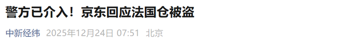 针对法国仓遭遇盗抢事件,京东回应中新经纬称,北京时间12月22日,位于法国巴黎地区的京东仓储遭 遇盗抢,当地警方已介入调查处理。目前仓库已恢复正常运营,我们关注到相关方面披露的"重大损失 数据",与实际情况有较大出入。 京东方面表示,近年来,京东加速推进"全球织网计划",已在全球23个国家和地区建设了超130个各类 型海外仓,并合法合规运营。 警方已介入!京东回应法国仓被盗 来源:中新经纬编辑:孟媛校对:张丽媛审核:张晓雅 ...