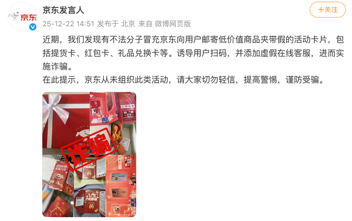 12月22日,@京东发言人 发文称,近期发现有不法分子冒充京东向用户邮寄低价值商品夹带假的活动 卡片,包括提货卡、红包卡、礼品兑换卡等。诱导用户扫码,并添加虚假在线客服,进而实施诈骗。在 此提示,京东从未组织此类活动,请大家切勿轻信,提高警惕,谨防受骗。 ...
