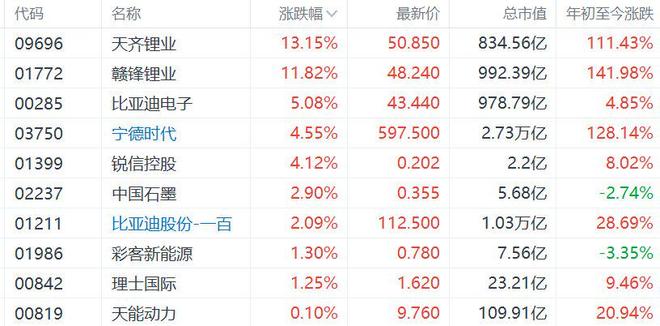 格隆汇10月2日|港股市场锂电池概念股全线上涨,其中,天齐锂业涨超13%,赣锋锂业涨超11%,比 亚电子涨超5%,宁德时代涨超4%。 | 代码 | 名称 | 涨跌幅 √ | 最新价 | 总市值 | 年初至今涨跌 | | --- | --- | --- | --- | --- | --- | | 096960 | 天齐锂业 | 13.15% | 50.850 | 834.56亿 | 111.43% | | 01772 | 赣锋锂业 | 11.82% | 48.240 | 992.39亿 | 141.98% | | 00285 | 比亚迪电子 | 5.08% | 43.440 | 978.79亿 | 4.85% | | 03750 | 宁德时代 | 4.55% | 597.500 | 2.73万亿 | 128.14% | | 01399 | 锐信控股 | 4.12% | 0.202 | 2.2亿 | 8.02% | | 02237 | 中国石墨 | 2.90% | 0.355 | 5.68亿 | -2.74% | | 01211 | 比亚迪股份 -- 百 | 2.09% | 112.500 | 1.03万亿 | ...