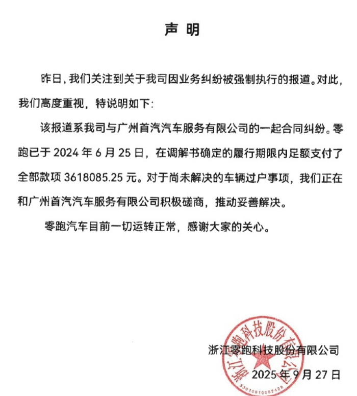 公司声明与回应 - 零跑汽车发布声明回应被列为失信被执行人 称与广州首汽汽车服务有限公司存在合同纠纷[1][4] - 公司已于2024年6月25日足额支付全部款项361.81万元(具体金额为3618085.25元)[1][4] - 目前正就车辆过户事项与对方积极磋商推动解决 强调公司一切运转正常[1][4][5] 法律纠纷详情 - 广州市白云区人民法院于9月25日将浙江零跑科技股份有限公司及子公司凌跑汽车商贸列为失信被执行人[1] - 执行案号为(2025)粤0111执13502号 依据文号为(2023)粤0111民初25175号[1] - 凌跑汽车商贸欠付金额包括租金41.6万元、购车款271.57万元、违约金44.64万元及律师费4万元[2] - 浙江零跑科技对子公司债务承担连带清偿责任 付款期限原定为2024年6月27日前[2]