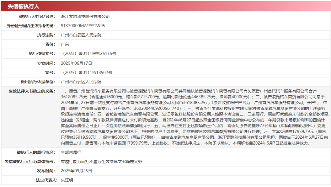 法律纠纷与执行情况 - 浙江零跑科技股份有限公司及其全资子公司凌跑汽车商贸有限公司被广州市白云区人民法院列为失信被执行人 案号为(2025)粤0111执13502号 执行依据文号为(2023)粤0111民初25175号[1][2] - 被执行人全部未履行生效法律文书确定的义务 具体行为属于有履行能力而拒不履行[2] - 立案时间为2025年6月17日 失信被执行人信息发布时间为2025年9月25日[2] 债务具体构成 - 凌跑汽车商贸有限公司拖欠广州首汽汽车服务有限公司合计361.81万元 包括租金41.6万元 购车款271.57万元 逾期付款违约金44.64万元及律师费4万元[2][4] - 债务支付期限为2024年6月27日前一次性付清 浙江零跑科技股份有限公司对上述债务承担连带清偿责任[2][4] - 若未按期履行 债权人可就剩余未付款项及违约金申请强制执行 违约金计算基数为未付款项 自2024年6月27日起按全国银行间同业拆借中心一年期贷款市场报价利率的四倍计收[2] 资产过户安排 - 零跑汽车及凌跑汽车商贸需在支付款项后三个月内协助原告办理73台车辆的过户登记手续 相关费用及罚款由凌跑汽车商贸承担[2][5] - 案件受理费17959.79元及保全费5000元由零跑汽车及凌跑汽车商贸承担 支付期限同为2024年6月27日[2] 相关人员影响 - 零跑汽车创始人兼董事长朱江明被列为限制消费人员 执行法院为广州市白云区人民法院 案号与失信执行案号一致[2] - 限制消费令于2025年6月17日立案 朱江明身份证号3301061967****0152[2] 债权人背景 - 债权人广州首汽汽车服务有限公司为首汽租赁有限责任公司全资子公司 首汽租赁为北京首汽(集团)股份有限公司控股子公司 实际控制人为北京市人民政府[5]