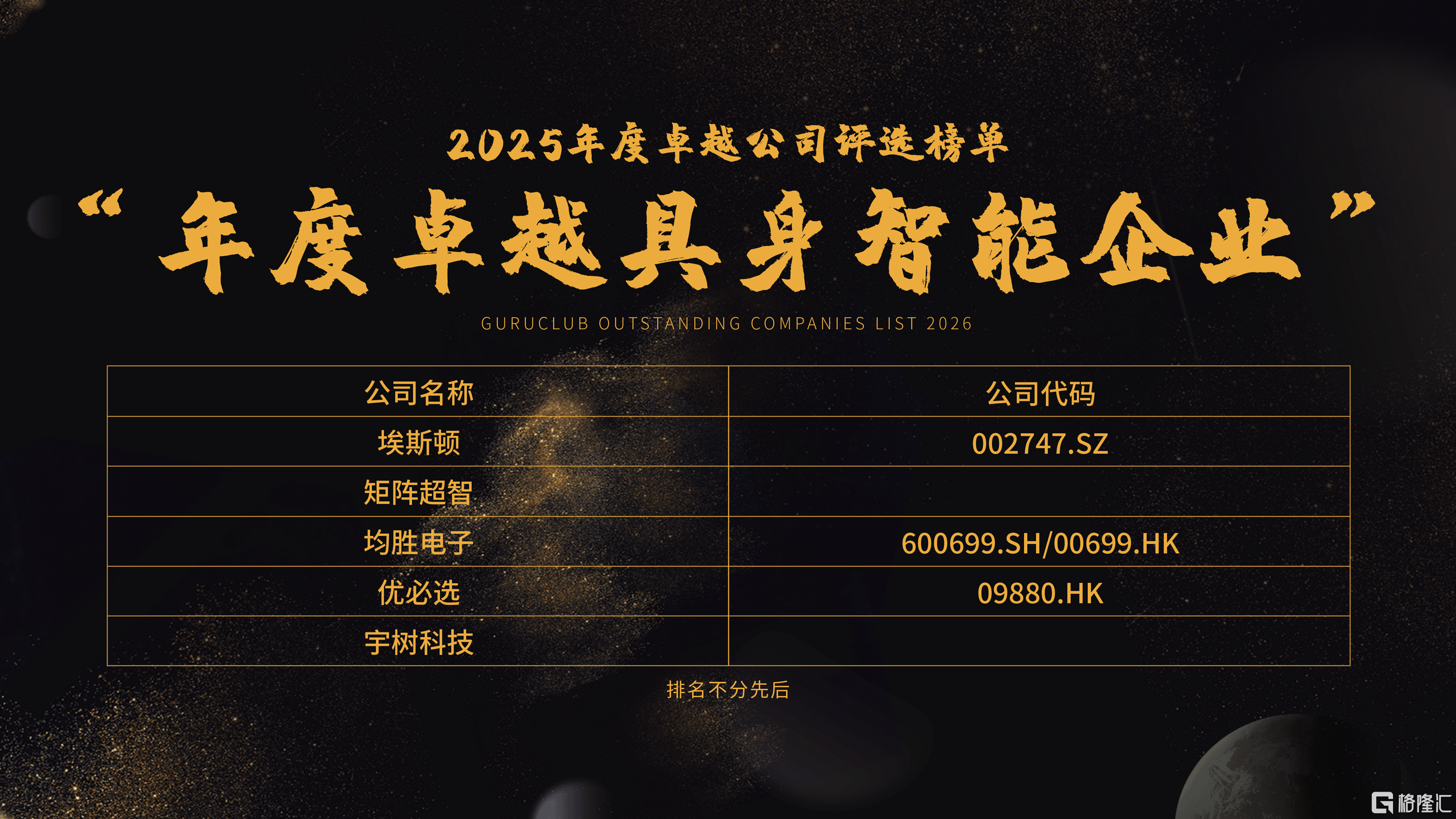 活动与奖项概况 - 格隆汇于12月22日在线举办“科技赋能·资本破局”分享会,并揭晓“金格奖”年度卓越公司评选榜单 [1] - 埃斯顿、矩阵超智、均胜电子、优必选、宇树科技五家企业荣获“年度卓越具身智能企业”奖项,排名按公司首字母顺序排列 [1] 奖项评选标准与目的 - “年度卓越具身智能企业”奖旨在表彰在具身智能领域做出卓越贡献的企业与团队 [4] - 评选围绕技术原创性与工程实现能力、商业化落地规模与可持续性、产业链协同与生态贡献、产品竞争力与市场领导地位等核心维度 [4] - 通过系统的数据评估及专家评议选出最终获奖者 [4] - 格隆汇评选初衷为“全球视野,下注中国”,旨在打造投资圈最具参考价值的上市公司及独角兽公司排行榜 [4] - 评选覆盖港交所、上交所、深交所、纽交所、美国证券交易所、纳斯达克证券交易所的全部上市公司及独角兽公司 [4] 行业定位与价值 - 具身智能企业被视为人工智能与物理世界深度融合的关键载体 [4] - 该领域企业正驱动智能制造、服务机器人、人机交互等场景的规模化商业应用 [4]