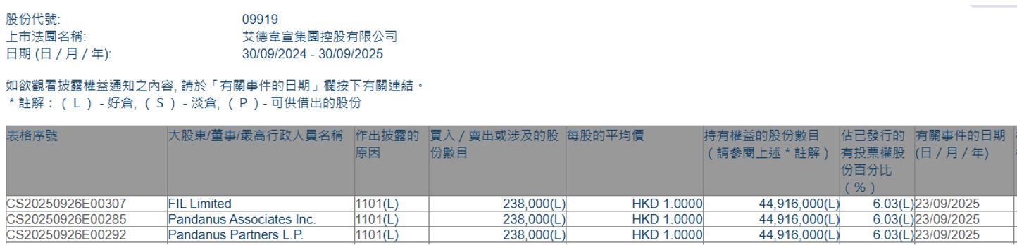 | 農橋序號 | 大股東/董事/最高行政人員名稱 作出披露的 買入 / 賣出或涉及的股 每股的平均價 | | | | 持有權益的 | | --- | --- | --- | --- | --- | --- | | | 历史三 | | | | 語參閱 了 | | CS20250926E00307 FIL Limited | | 1101(L) | 238,000(L) | HKD 1.0000 | 00 | | CS20250926E00285 | | Pandanus Associates Inc. 1101(L) | 238,000(L | HKD 1.0000 | 44 | | CS20250926E00292 | | Pandanus Partners L.P. 1101(L) | 238,000(L | HKD 1.0000 | 44 | 在持续深化奢侈品领域优势的同时,艾德韦宣亦积极开拓运动时尚新赛道。公司近期先后助力Adidas Originals在上海成功举办"三叶草女孩庆典",并助力 Under Armour在重庆举办了首个海外Curry Camp和全球首届Curry Con。 通过精准的策划 ...