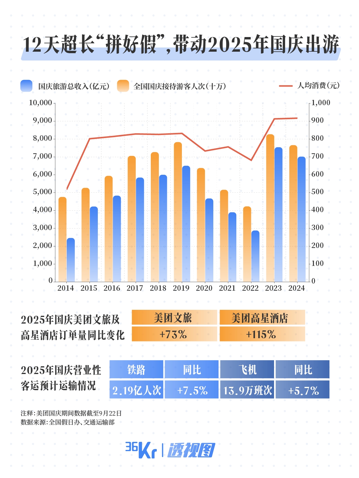"透视图"是36氪新推出的轻量化数据图文栏目——以数据透视趋势,以图片呈现要点。 "Talk is Cheap. Show me the data." 作者丨谢芸子 国庆始终是观察消费变迁的重要窗口,今年超长黄金周的到来,将创各项出行指标的新高。 36氪制图 交通运输部预测,2025年国庆中秋假期期间(9月29日至10月10日),全国铁路预计发送旅客约2.19亿人次,较去年同期增长7.5%;民航预计执行客运航班 总量13.9万班次,日均同比增长5.7%。多个旅游平台也显示,今年假期出游的人数同比大幅增长,旅游和消费或将进入全面的高峰期。 36氪制图 反映在资本市场上,9月以来,旅游股的表现呈分化趋势。再从各大企业上半年的财报表现看,无论是市值还是归母净利润,携程集团都断崖式领先。 36氪制图 大营收体量的航空公司,则因宏观环境、成本波动等原因,普遍处于亏损状态。或也因此,今年黄金周,航空公司放弃"机票内卷",消费者也普遍抱怨机票 的价格上涨,选位费偏高。 36氪制图 此外值得注意的是,除携程、中国中免、华住等头部企业,众多中小酒店、旅行社及景区,处于长期微利甚至亏损的状态。从这一层面看,整个旅游产业链 的利润 ...