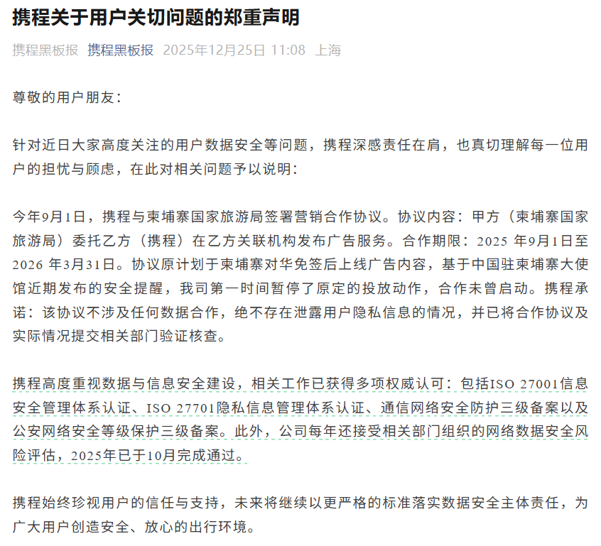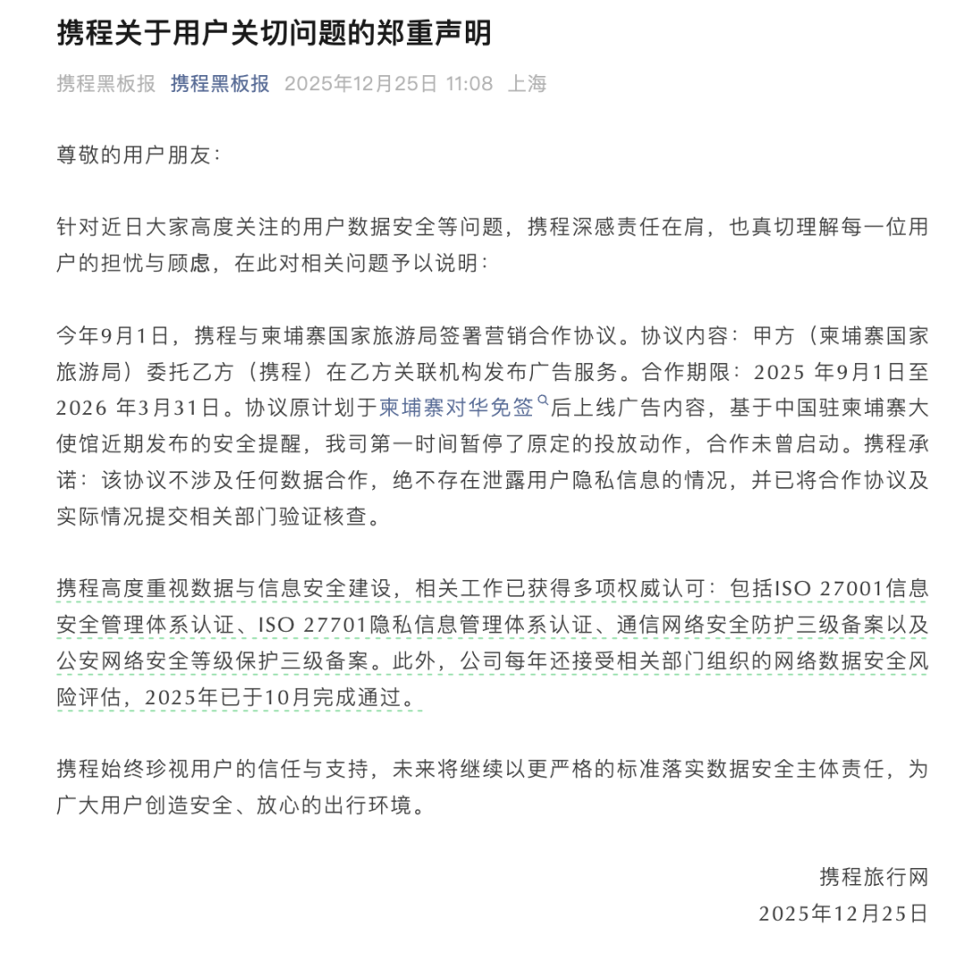 【导读】携程发布声明:与柬埔寨营销合作未启动,没有泄露用户隐私 12月25日,携程发布关于用户关切问题的声明称,基于中国驻柬埔寨大使馆近期发布的安全提醒,公司第一时间暂停了原定的投放动作,相关营销合作未 曾启动。 携程还承诺,相关合作协议不涉及任何数据合作,绝不存在泄露用户隐私信息的情况,并已将合作协议及实际情况提交相关部门验证核查。 尊敬的用户朋友: 针对近日大家高度关注的用户数据安全等问题,携程深感责任在肩,也真切理解每一位用户的担忧与顾虑,在此对相关问题予以说明: 今年9月1日,携程与柬埔寨国家旅游局签署营销合作协议。协议内容:甲方(柬埔寨国家旅游局)委托乙方(携程)在乙方关联机构发布广告服务。合作 期限:2025年9月1日至2026年3月31日。协议原计划于柬埔寨对华免签后上线广告内容,基于中国驻柬埔寨大使馆近期发布的安全提醒,我司第一时间暂 停了原定的投放动作,合作未曾启动。携程承诺:该协议不涉及任何数据合作,绝不存在泄露用户隐私信息的情况,并已将合作协议及实际情况提交相关 部门验证核查。 携程高度重视数据与信息安全建设,相关工作已获得多项权威认可:包括ISO27001信息安全管理体系认证、ISO2 ...